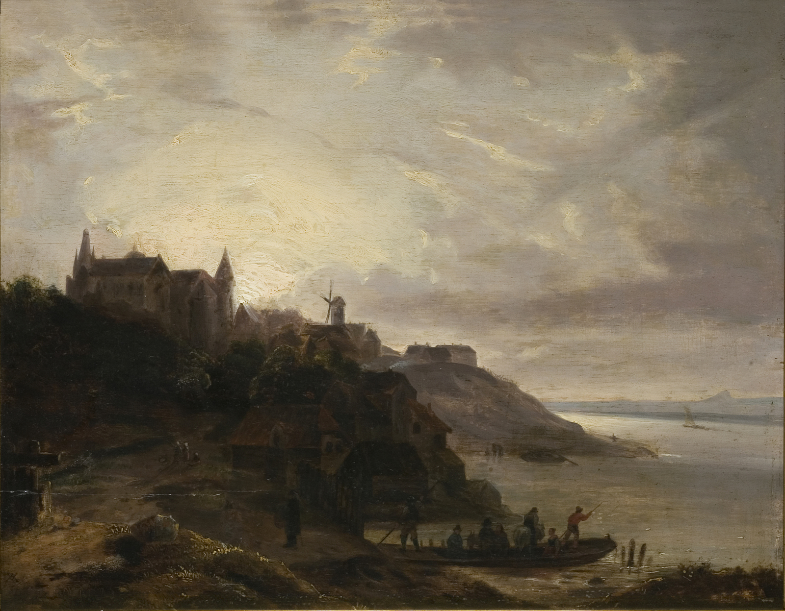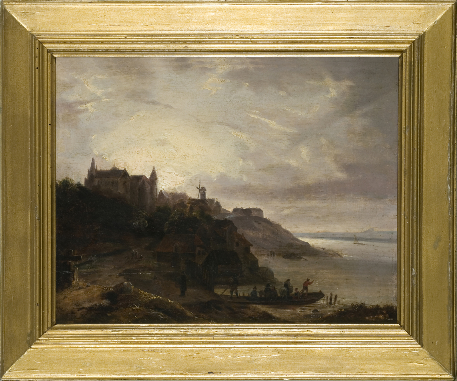 ARTISTA FIAMMINGO DEL XVIII SECOLO Paesaggio marino con pescatori. Olio su tavola. Cm 44,00 x 36,00. . Cornice presente