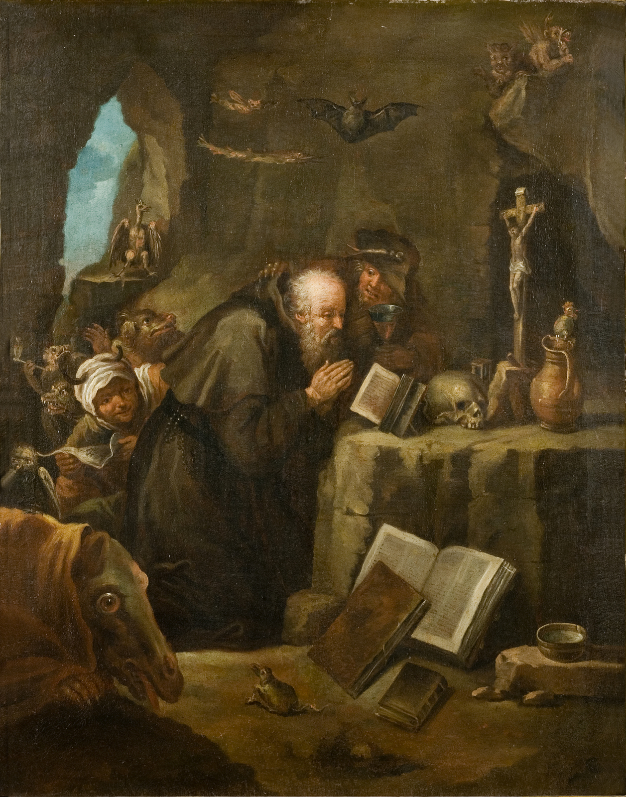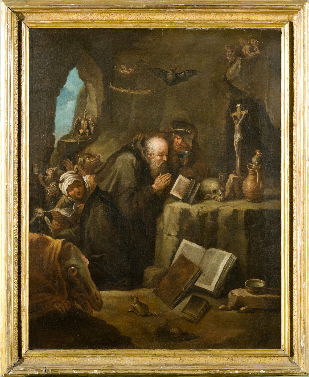 PITTORE FIAMMINGO DEL XVII SECOLO Le tentazioni di San Antonio. . Olio su tela. Cm 65,00 x 82,00. Siglato sul panno. . Cornice presente