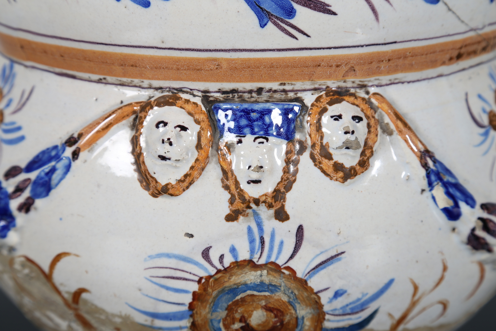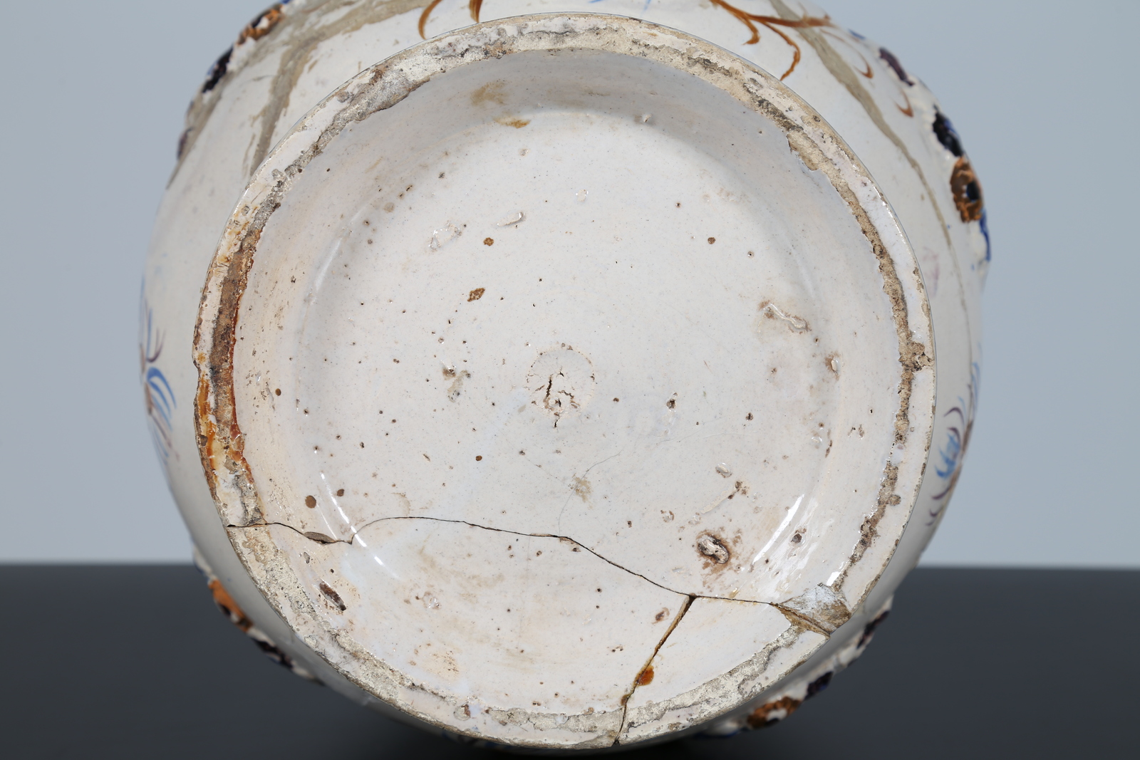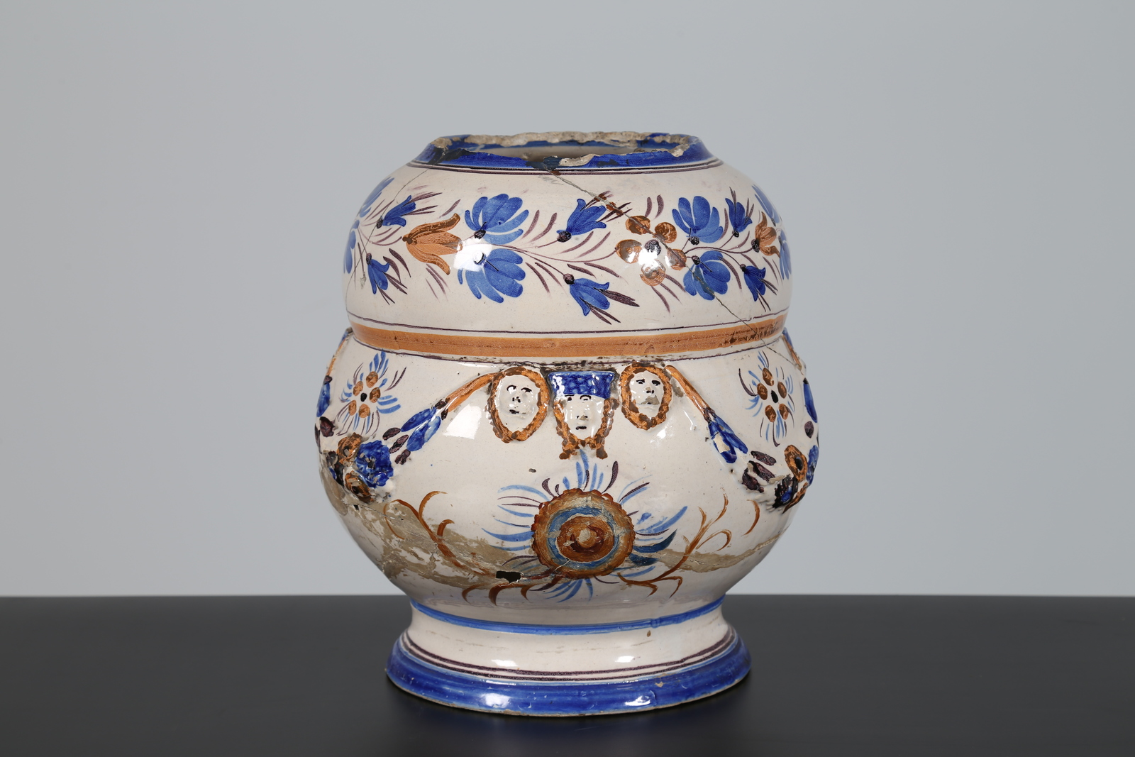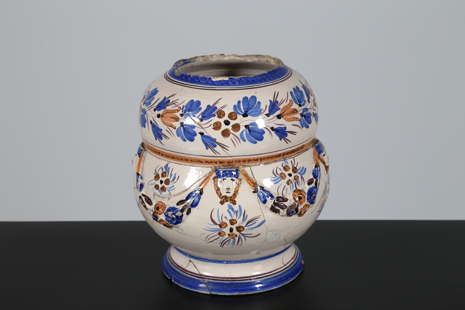 MANIFATTURA ITALIANA DEL XVII SECOLO Vaso in maiolica decorato a festoni e motivi floreali. . Cm 27,00 x 30,00. Sono presenti fratture.