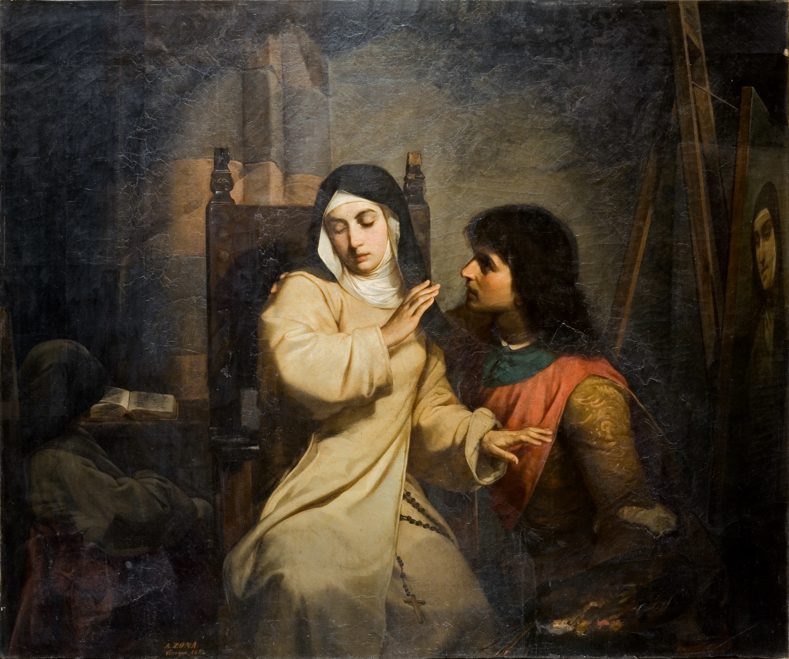 ZONA ANTONIO (1814 - 1892) Filippo Lippi seduce la monaca Lucrezia Buti. 1856. Olio su tela. Cm 166,00 x 139,00. Firma luogo e anno in basso a sinistra. La tela presenta cadute di colore in alto a destra. Il dipinto è opera di Antonio Zona, pittore veneto. Attratto dalla pittura di Tiziano e dai maestri veneti del Cinquecento, studia all'Accademia di Venezia. Verso gli anni quaranta si avvicina alla dottrina purista. L'opera in questione venne esposta nel 1856 all'Accademia di Venezia ( La pittura nel Veneto. L'Ottocento, tomo secondo, Milano 2003, Electa, p.853). Dopo l'Unità d'Italia viaggiò tra Milano e Roma. Bibliografia: La pittura nel Veneto, L'Ottocento, tomo secondo, Milano 2003, Electa, pp. 853-854. Cornice presente