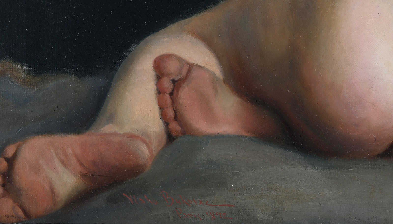 BUKOVAC VLAHO (1855 - 1922) Nudo di donna con grappolo d'uva. 1892. Olio su tela. Cm 66,00 x 63,00. Firma, data e luogo (Parigi) in basso a sinistra.