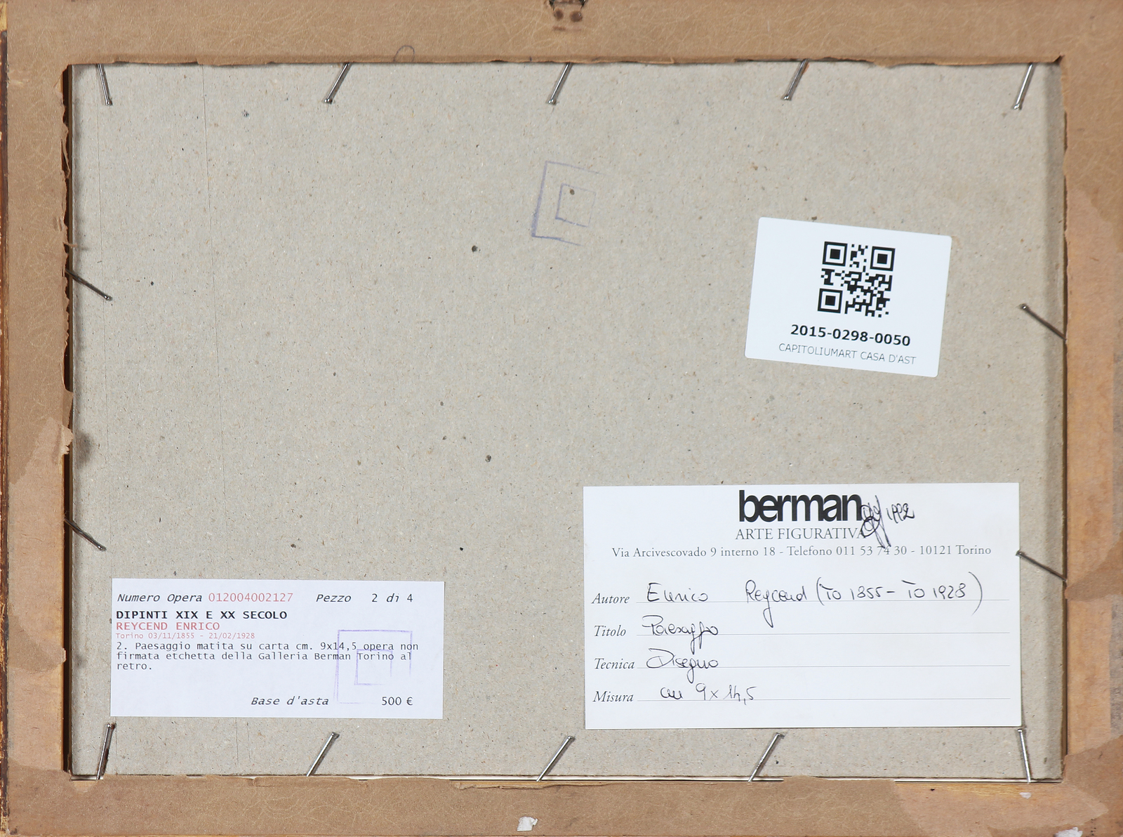 REYCEND ENRICO (1855 - 1928) Paesaggio. Disegno. Cm 14,50 x 9,00. Al retro cartiglio descrittivo a cura di Berman Arte figurativa, Torino. Cornice presente