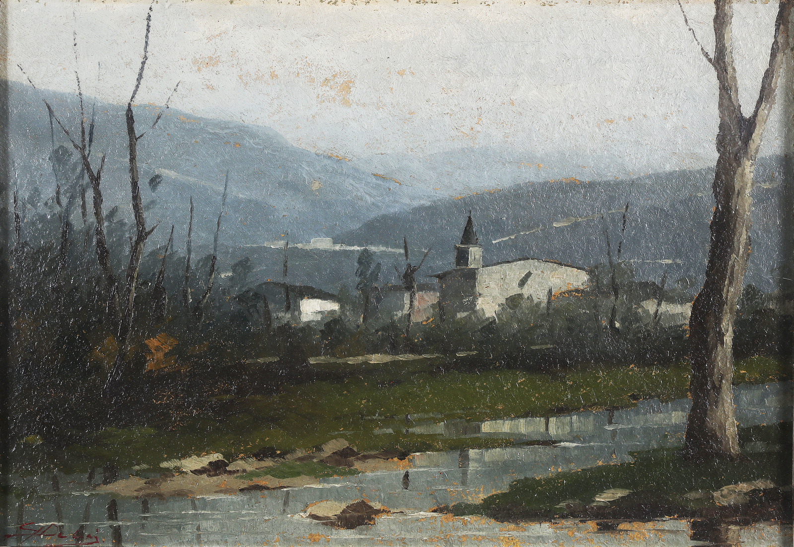 Lot 219 | DE LAI GINO (1891 - 1960) Paesaggio con chiesa. Olio su cartone pressato. Cm...