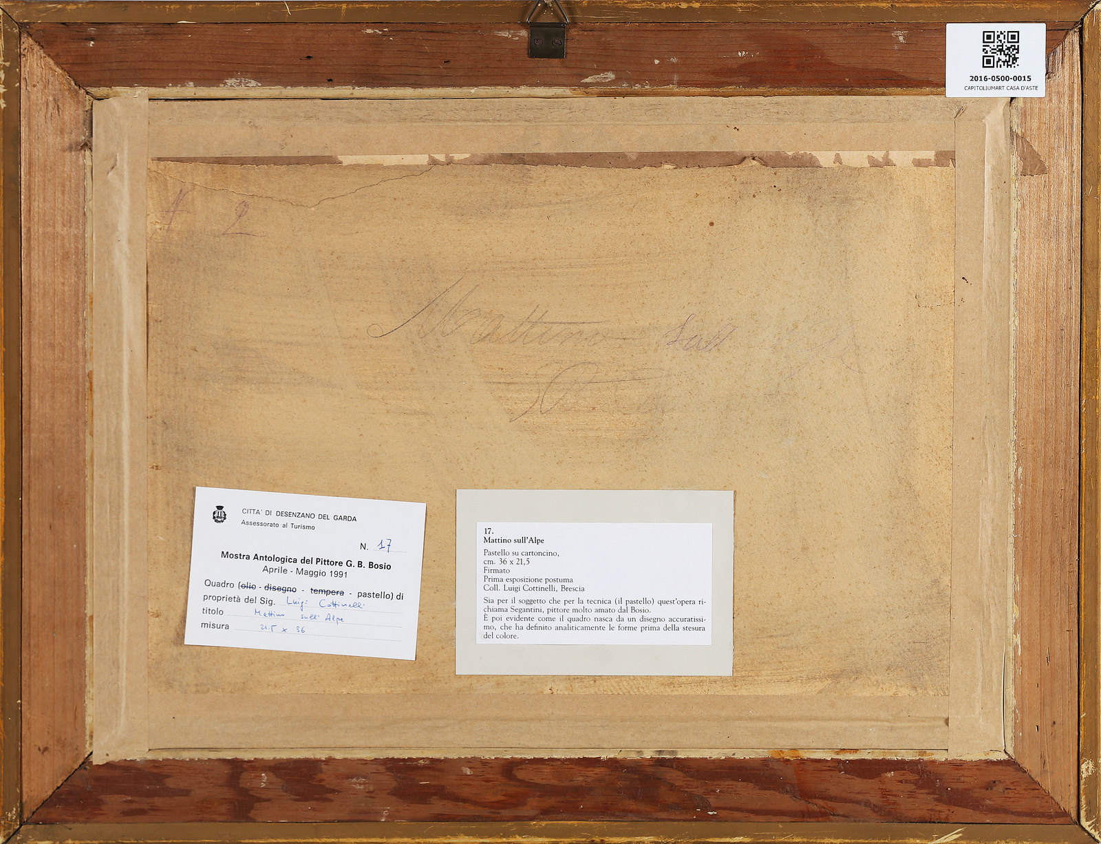 BOSIO GIANBATTISTA (1873 - 1946) Mattino sull'Alpe. Pastello su cartoncino . Cm 21,50 x 36,00. Al retro titolo e cartiglio mostra antologica di Desenzano del 1991. Cornice presente