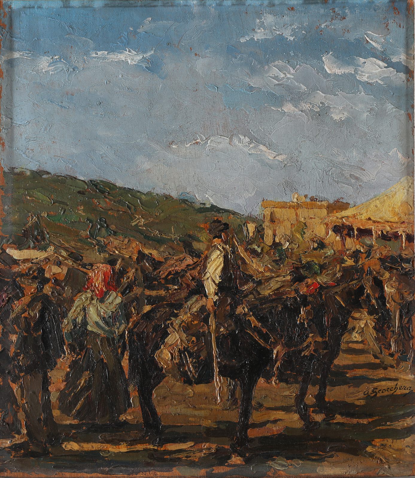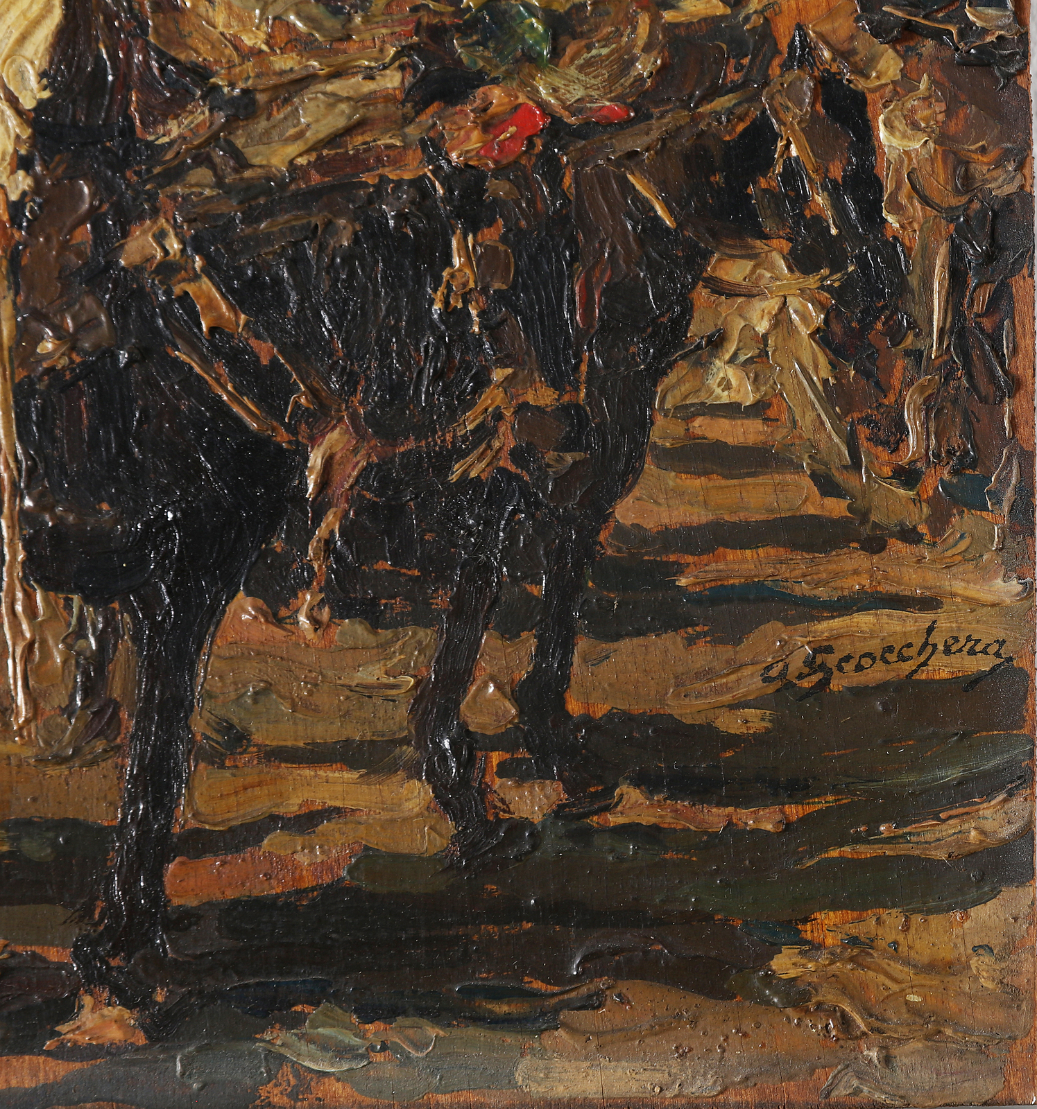 SCOCCHERA ALFREDO (1887 - 1955) Cavalieri in un paesaggio. Olio su tavola. Cm...