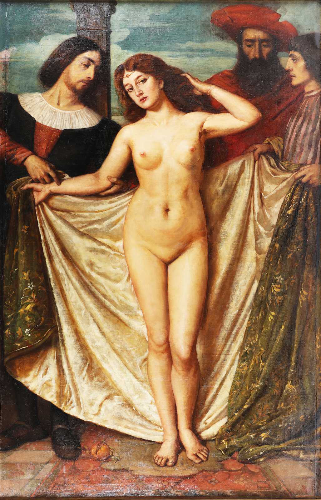PASINI EMILIO (1872 - 1953) Nudo di donna con personaggi. Olio su tela. Cm 130,00 x 200,00. Firma al retro. Cornice presente