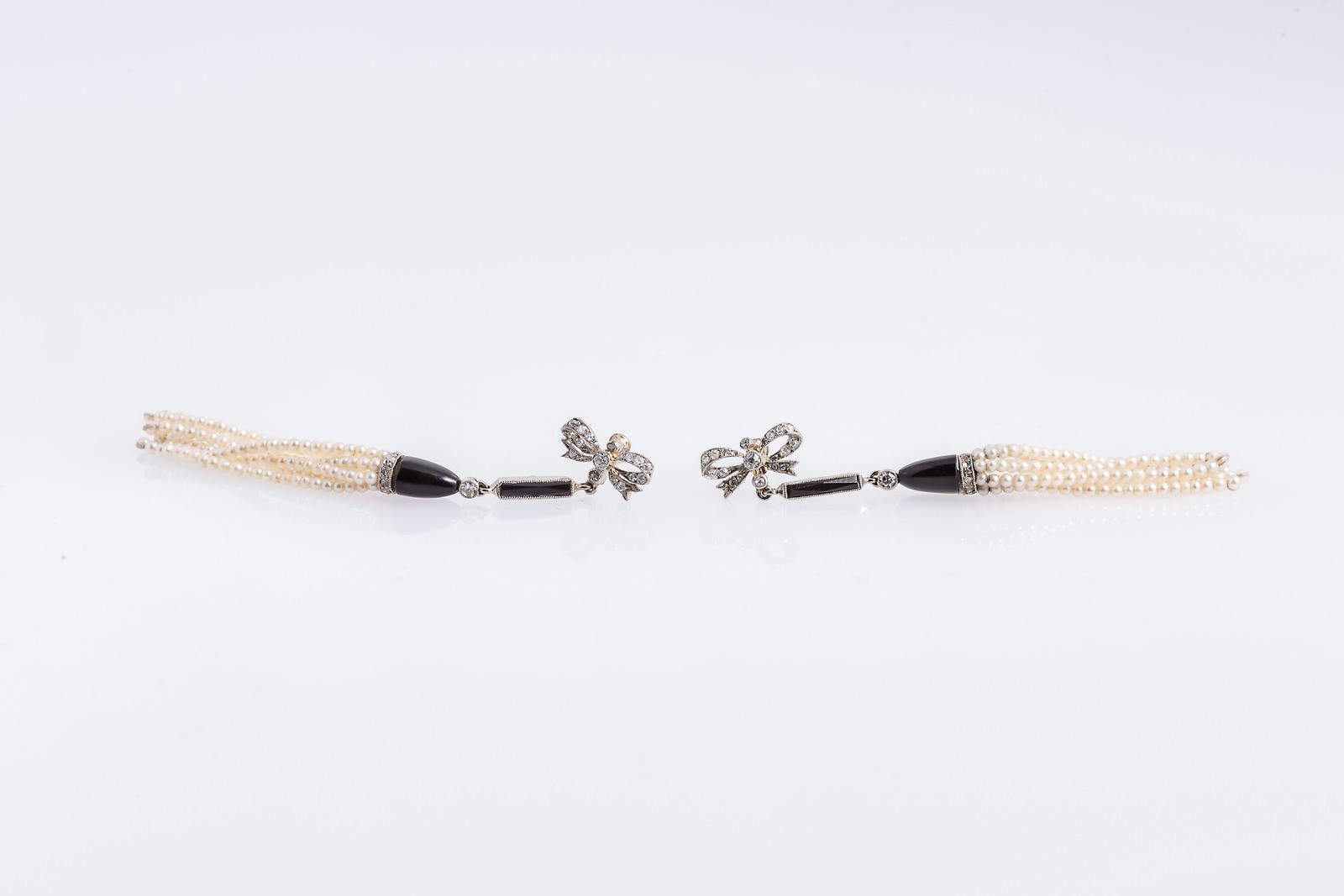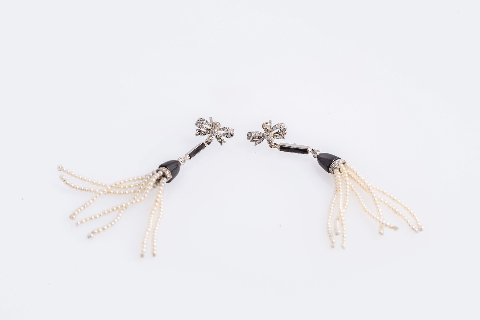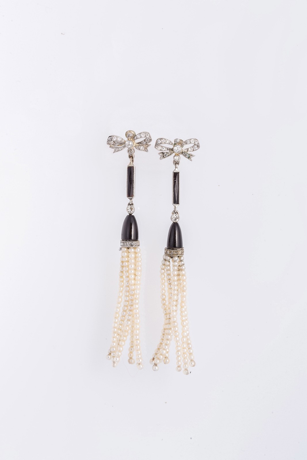 Orecchini anni '20 in oro, onice, brillanti e nappe di perline. . . [Nessun...