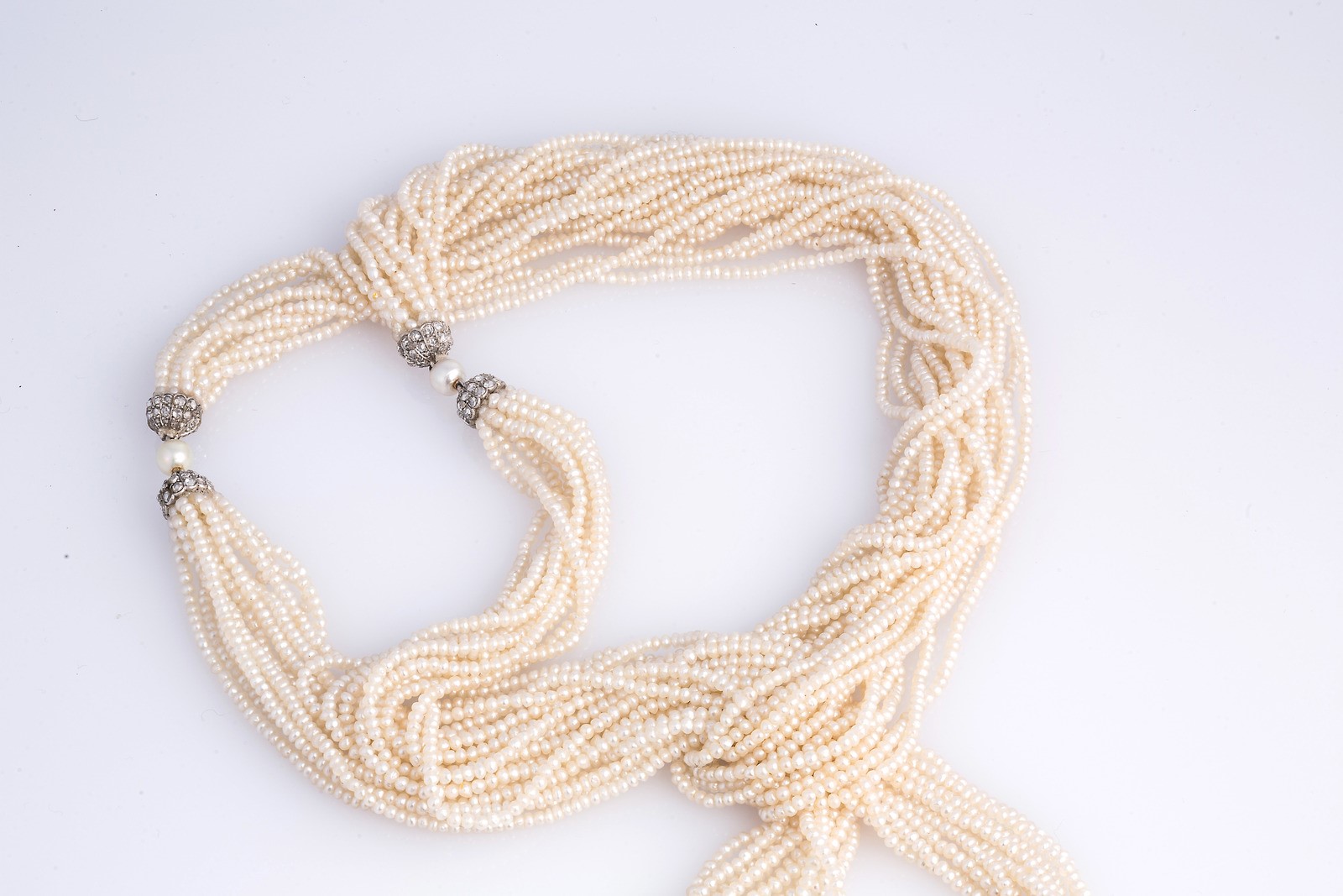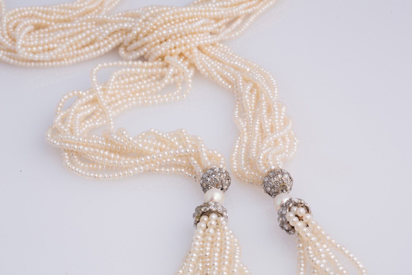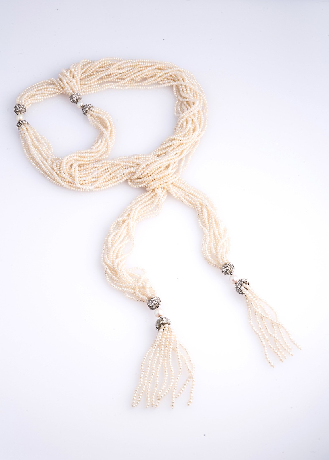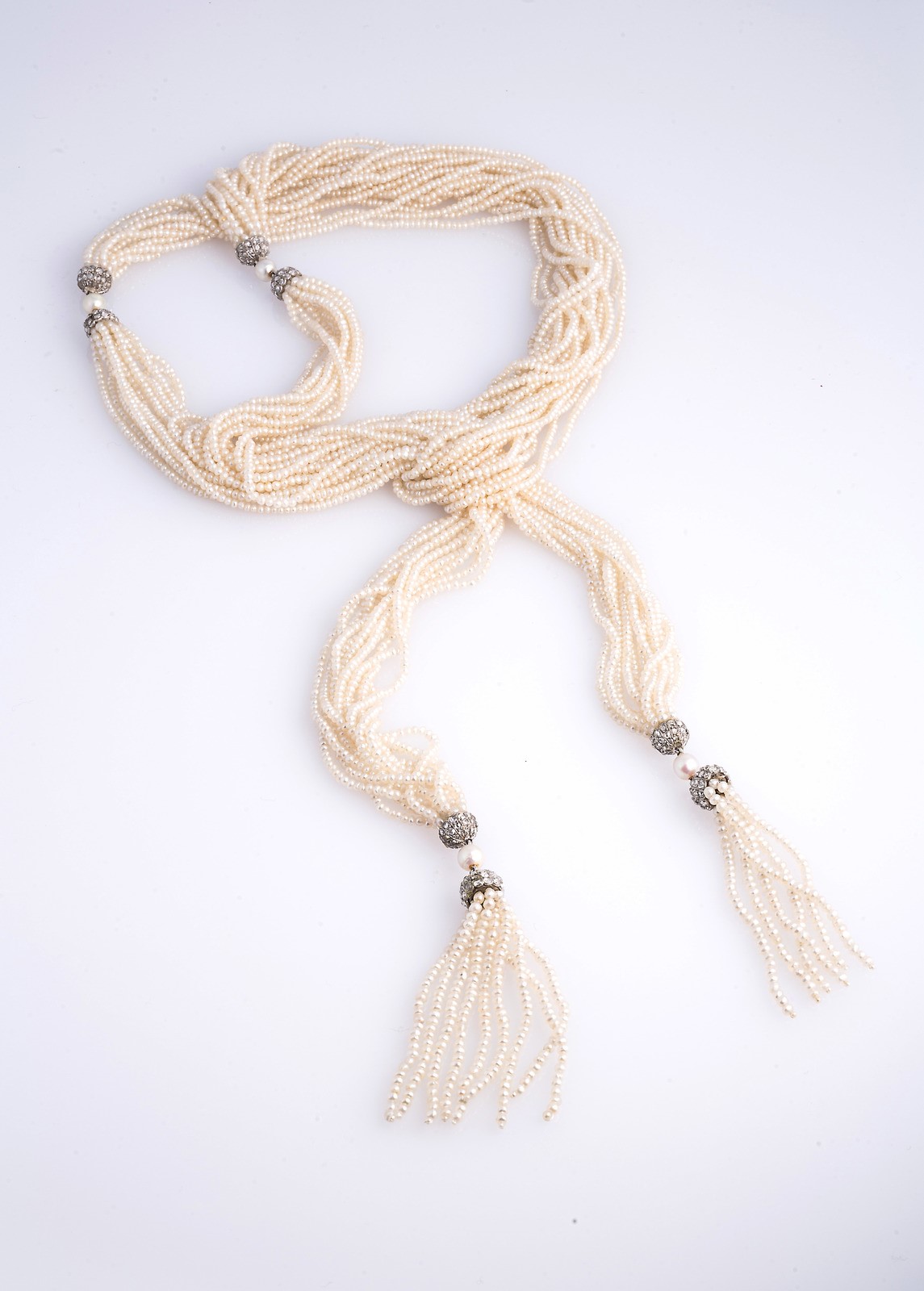 Sciarpa anni '20 in perline con quattro terminali in platino e diamanti, lunghezza cm 65. . .