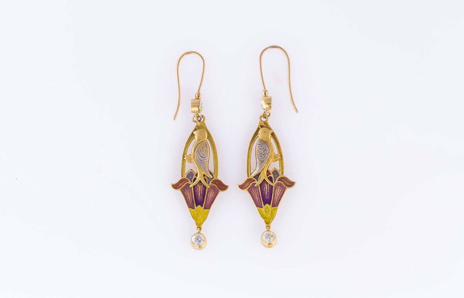 Paio di orecchini art nouveau in oro, smalto e diamanti gr 11.90. . . [Nessun...