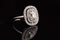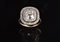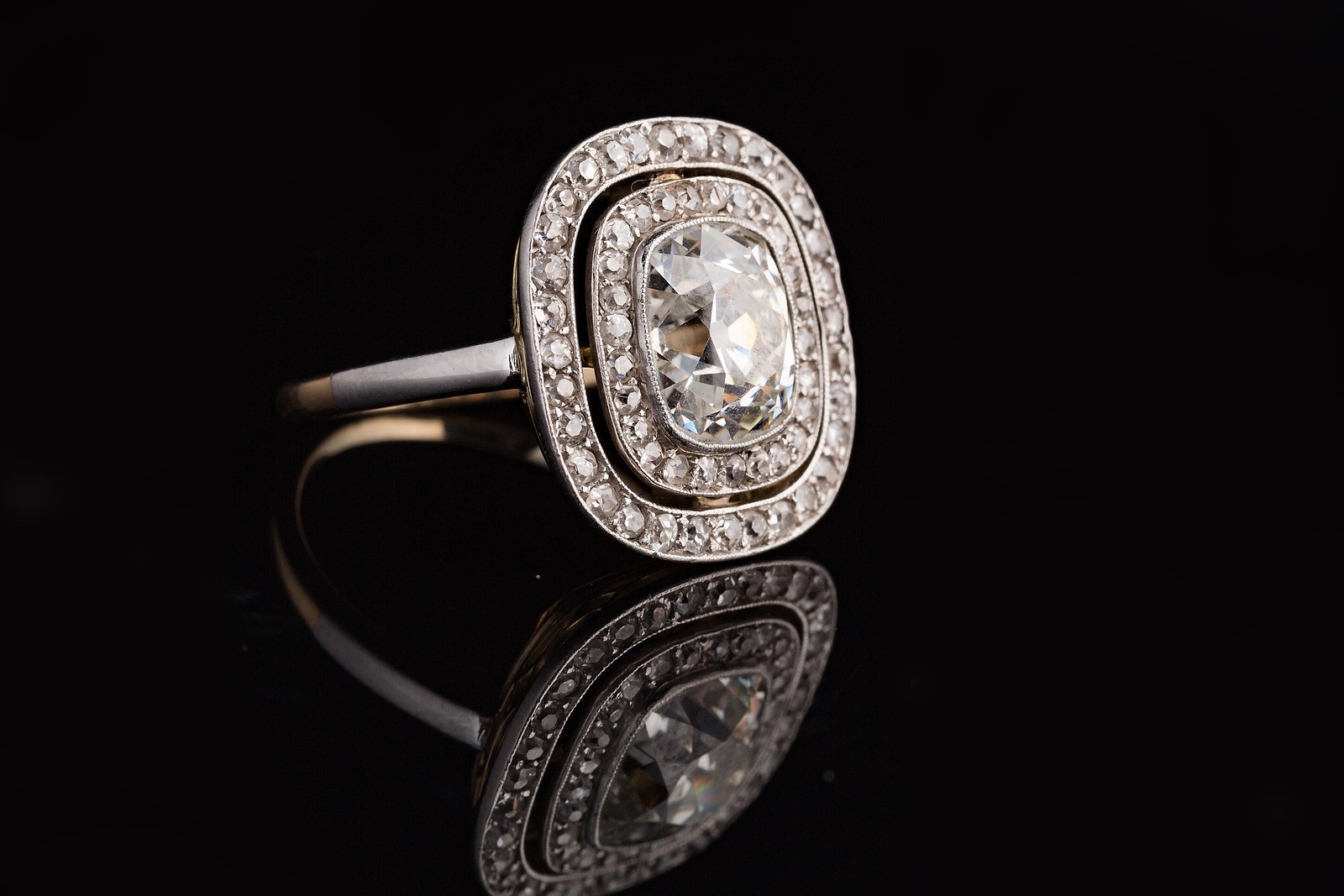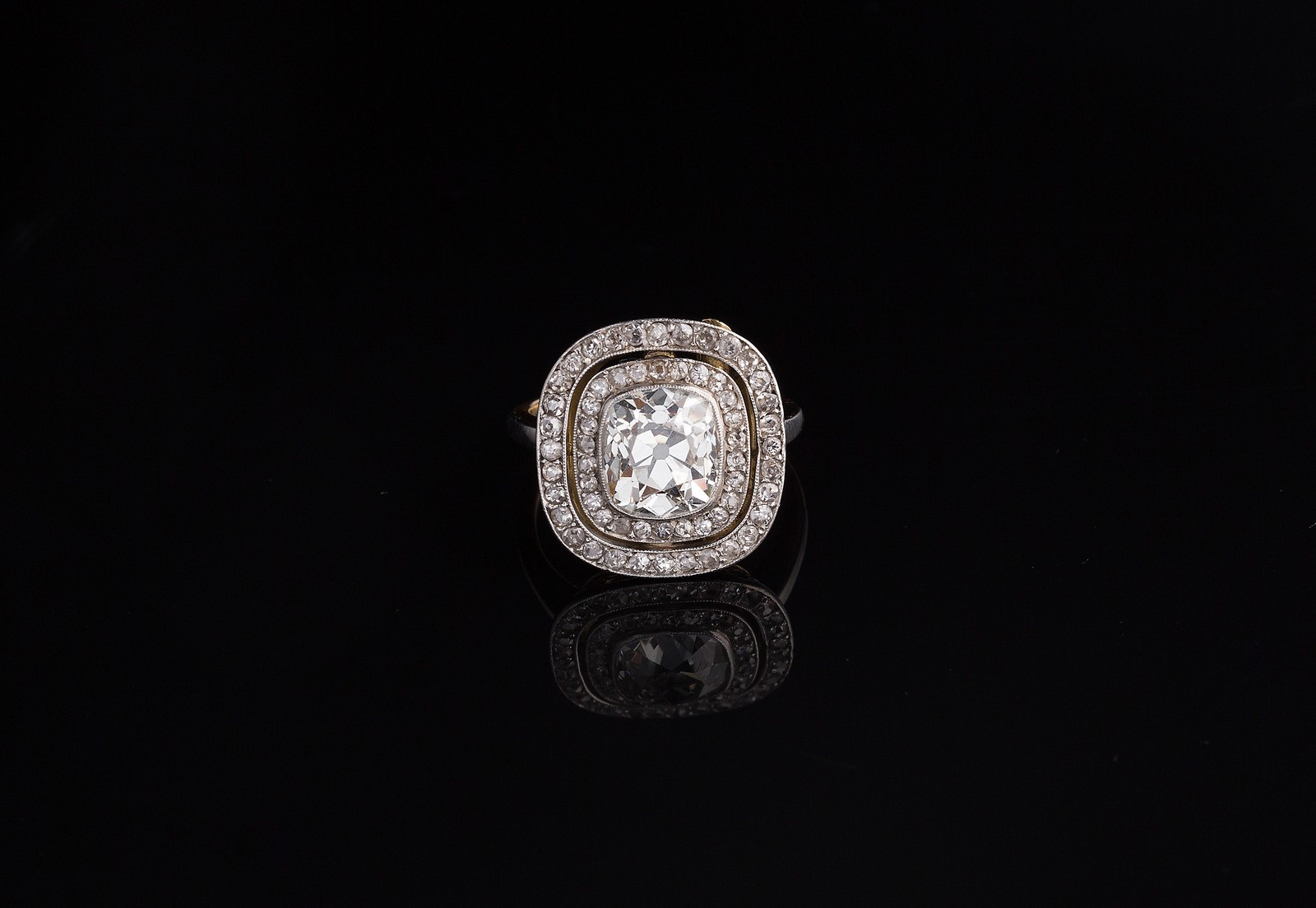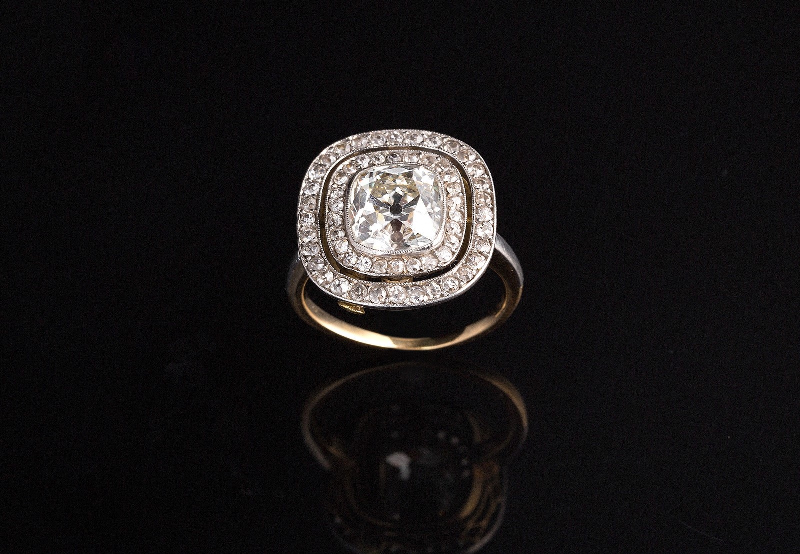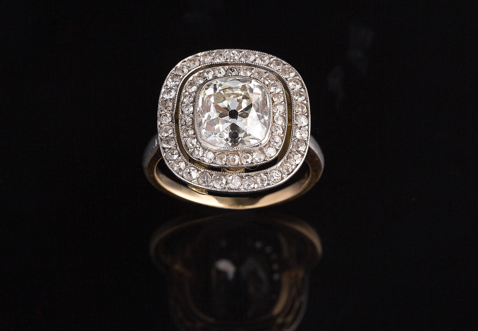 Anello anni '30 in oro bianco e giallo con diamante centrale cushon shape di taglio antico, peso stimato cts 2.85/3 circa contornato da diamanti per cts 0.60. . .