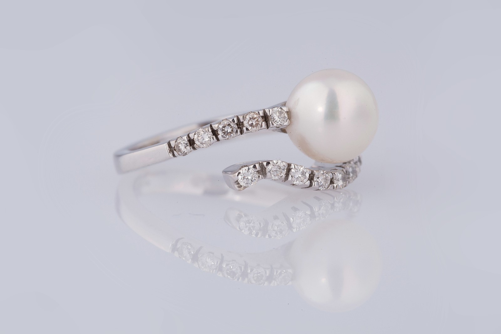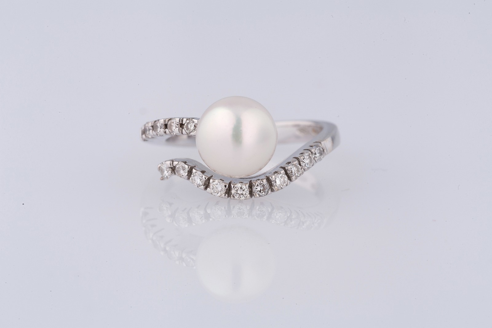 DAMIANI Anello in oro bianco gr 5.50, cts 0.20 circa, diamanti e perle coltivate, firmato. . .