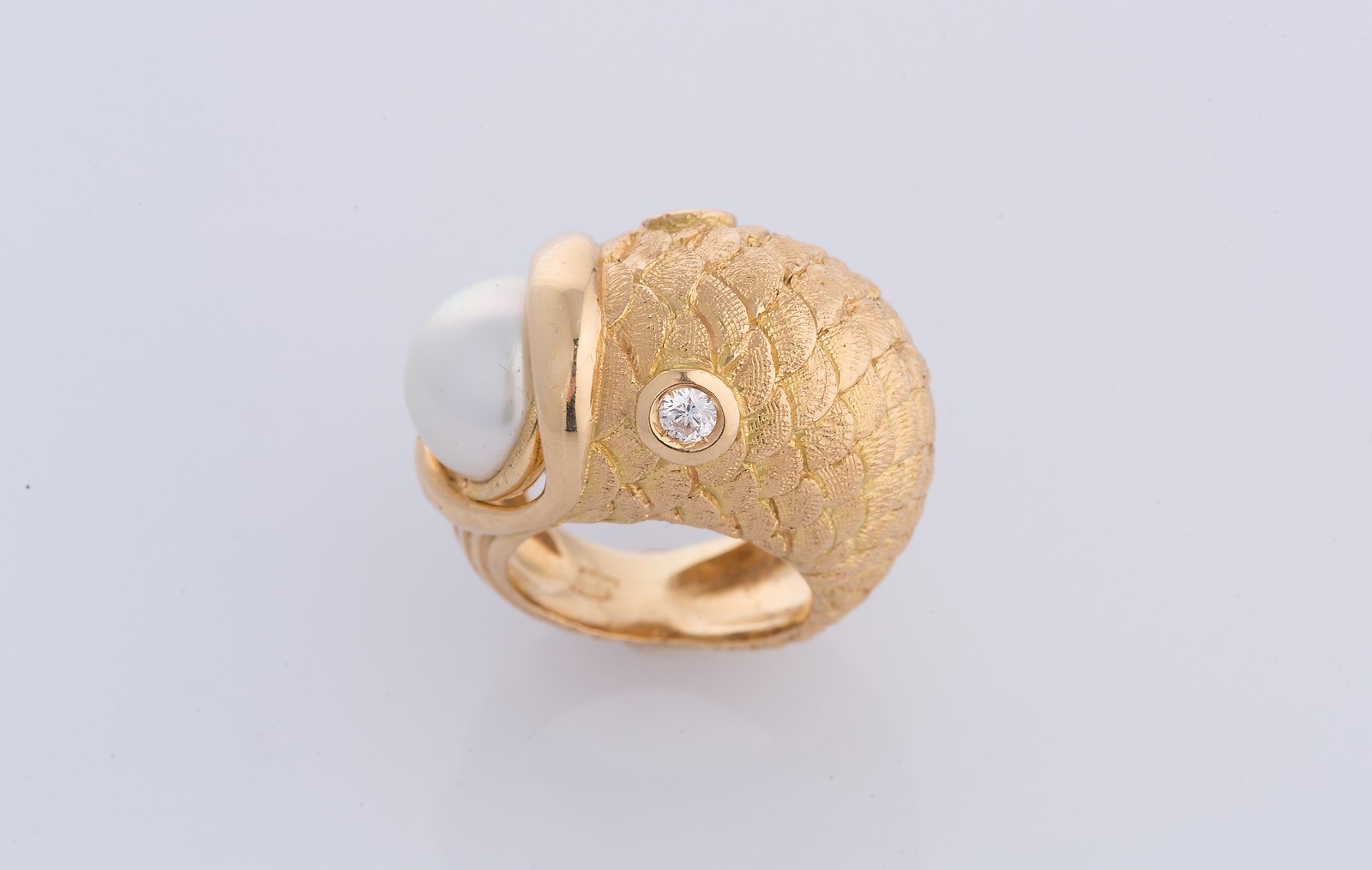Anello "Pesce" in oro gr 31.30, perla australiana e diamanti cts 0.25. . ....