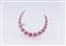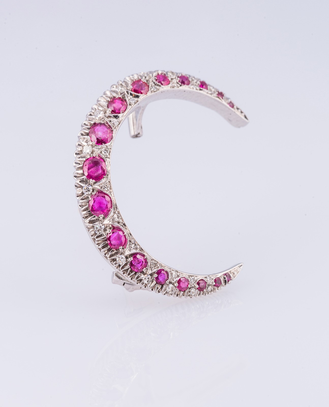 Spilla a mezzaluna in oro bianco gr 6 e rubini per cts. 0,45 circa, diamanti cts. 0,18. . .