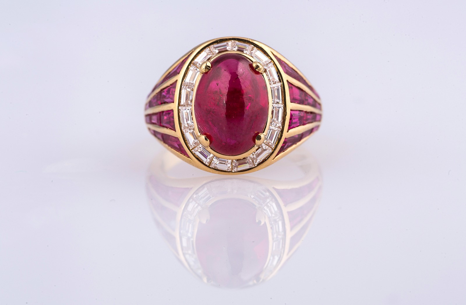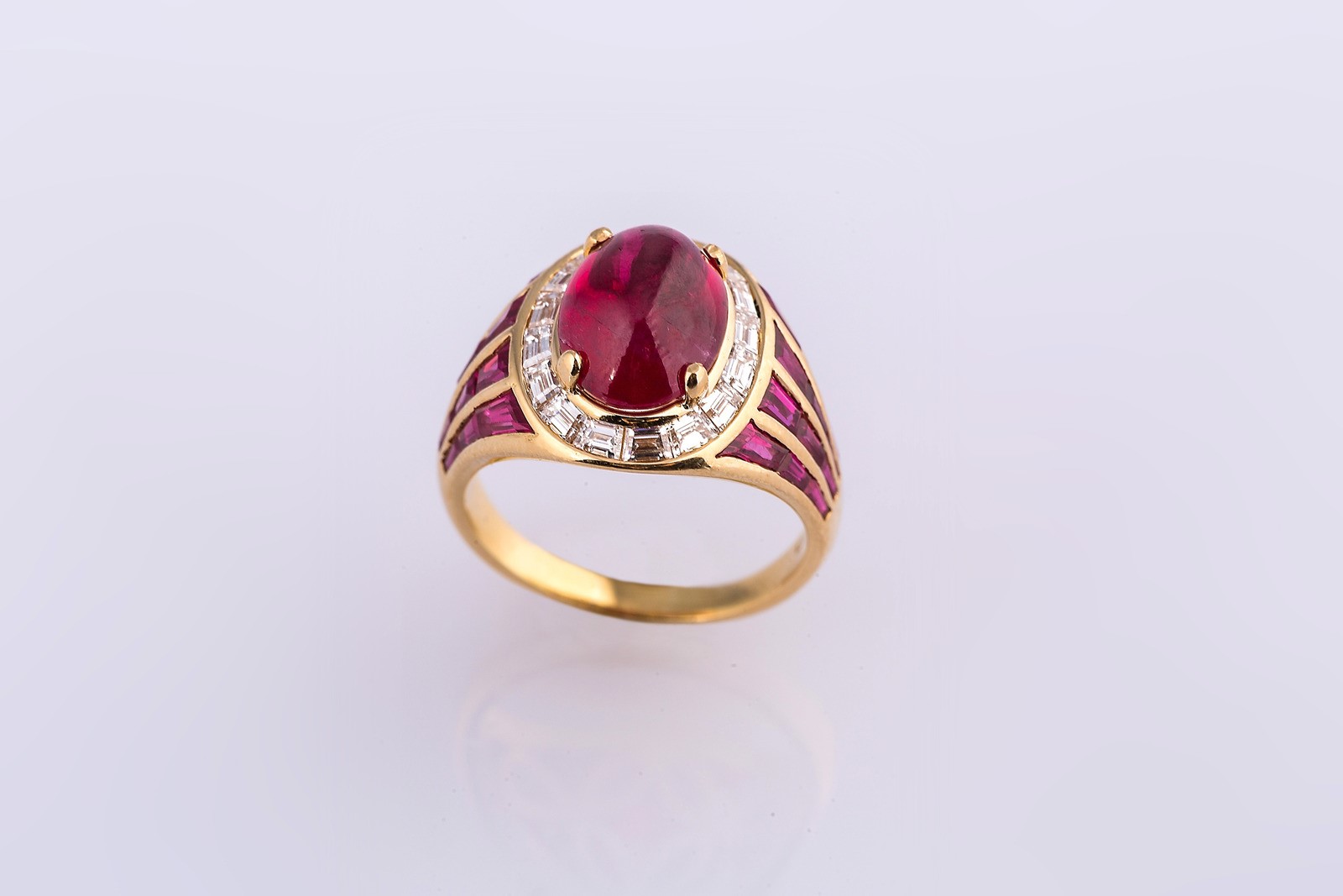 Lot 117 | PEDERZANI Anello con rubino cabochon cts 4.40 circa, brillanti per cts 1.00...