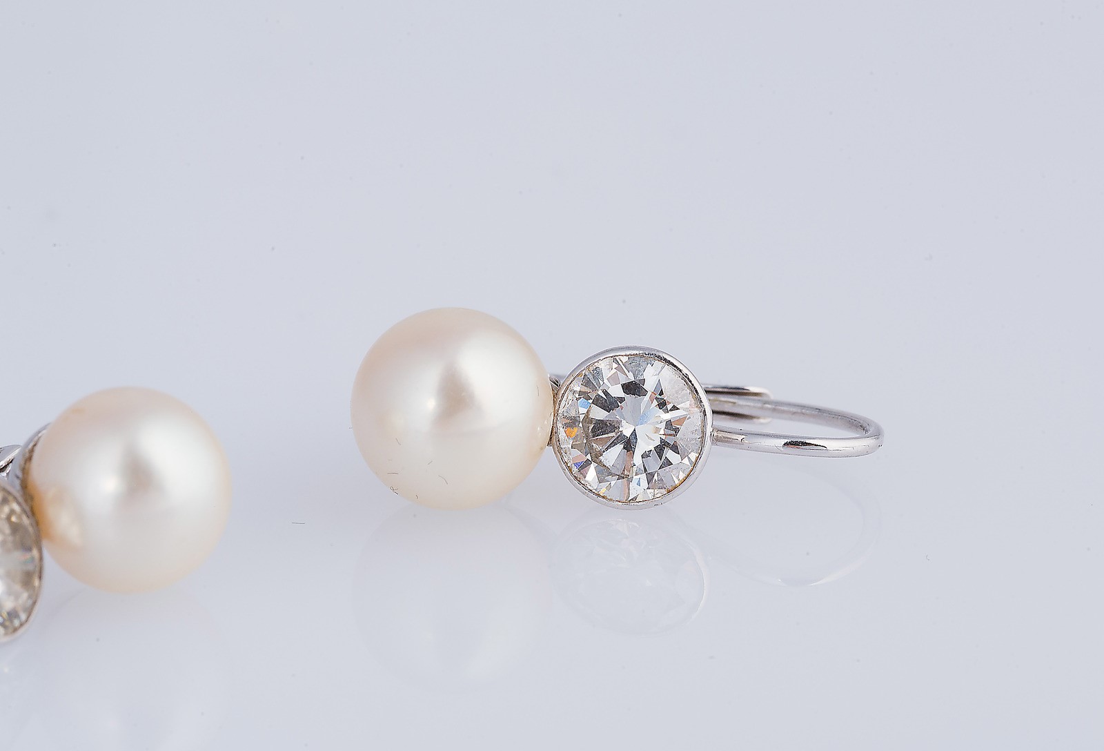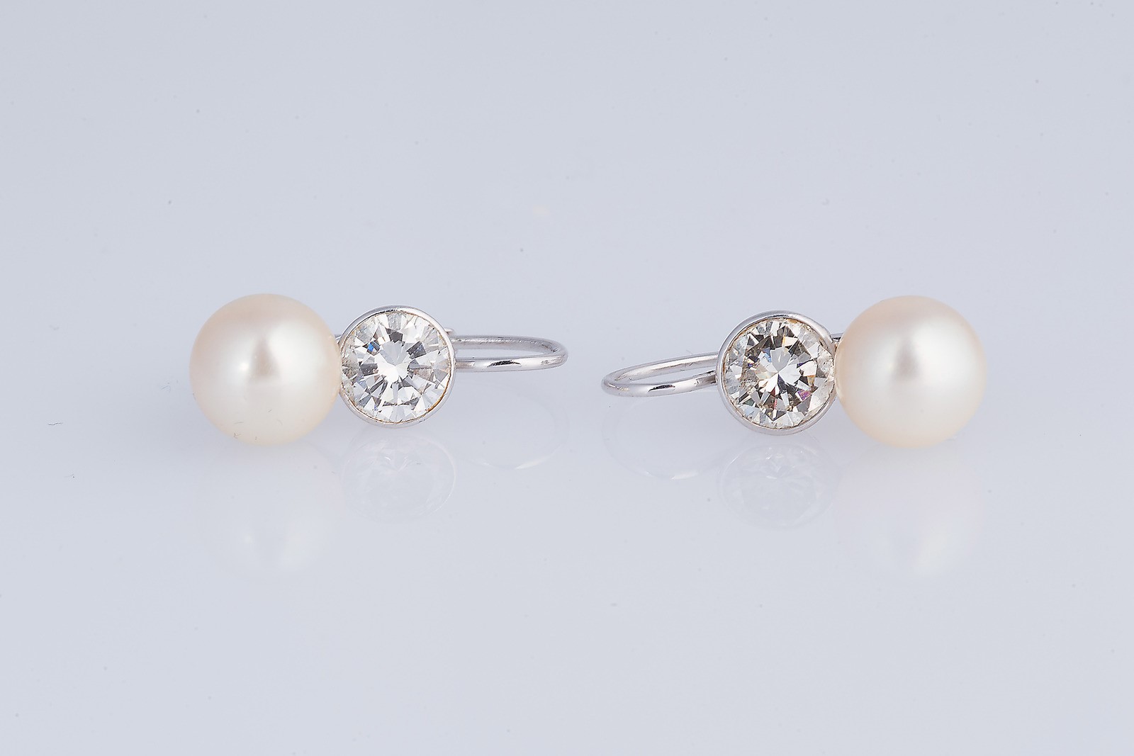 Paio di orecchini con perle di mm 9 e due diamanti da 1 ct circa cad. . ....