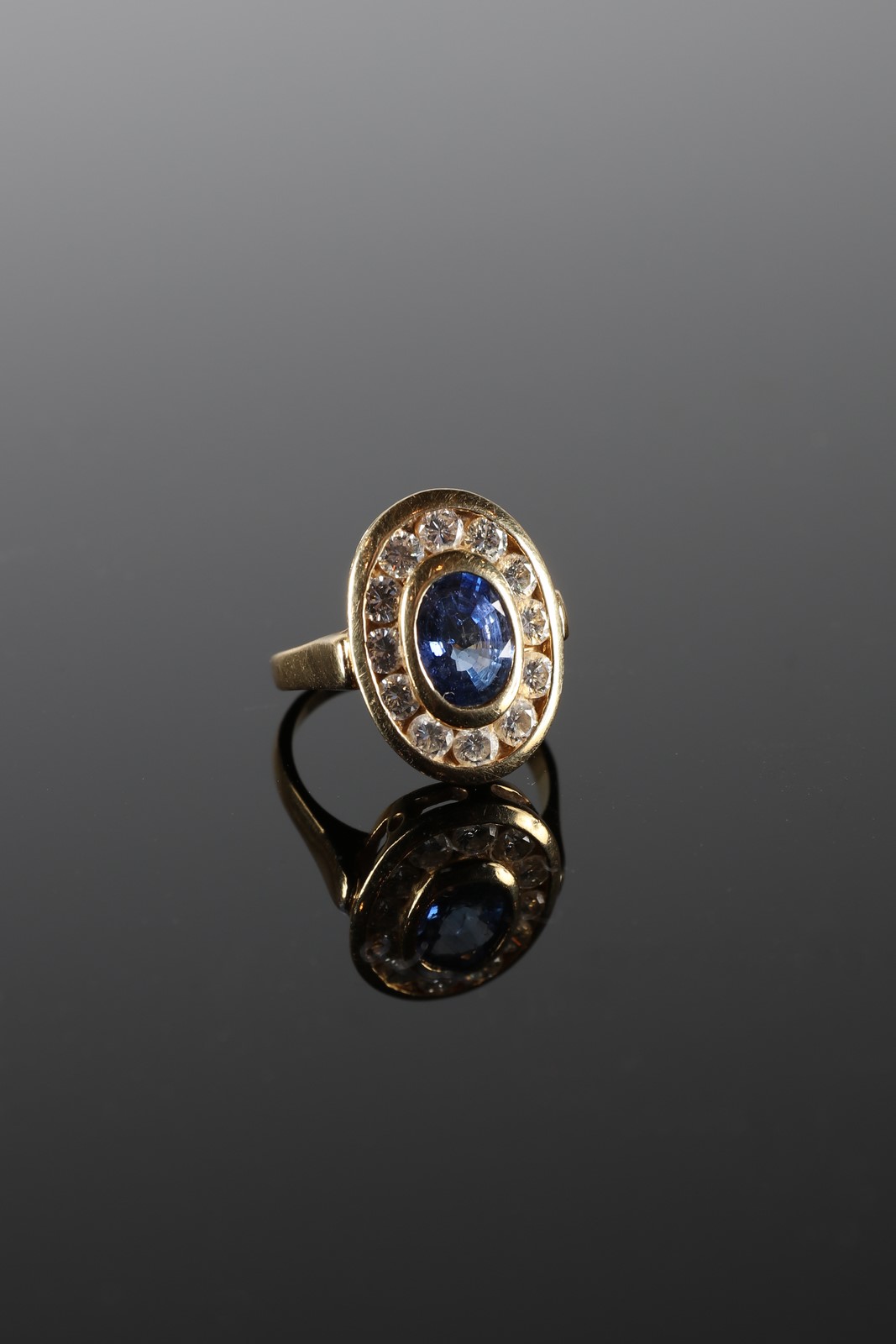 Anello in oro giallo 18 kt, diamanti cts 1.44 e zaffiro cts 2 circa. . .