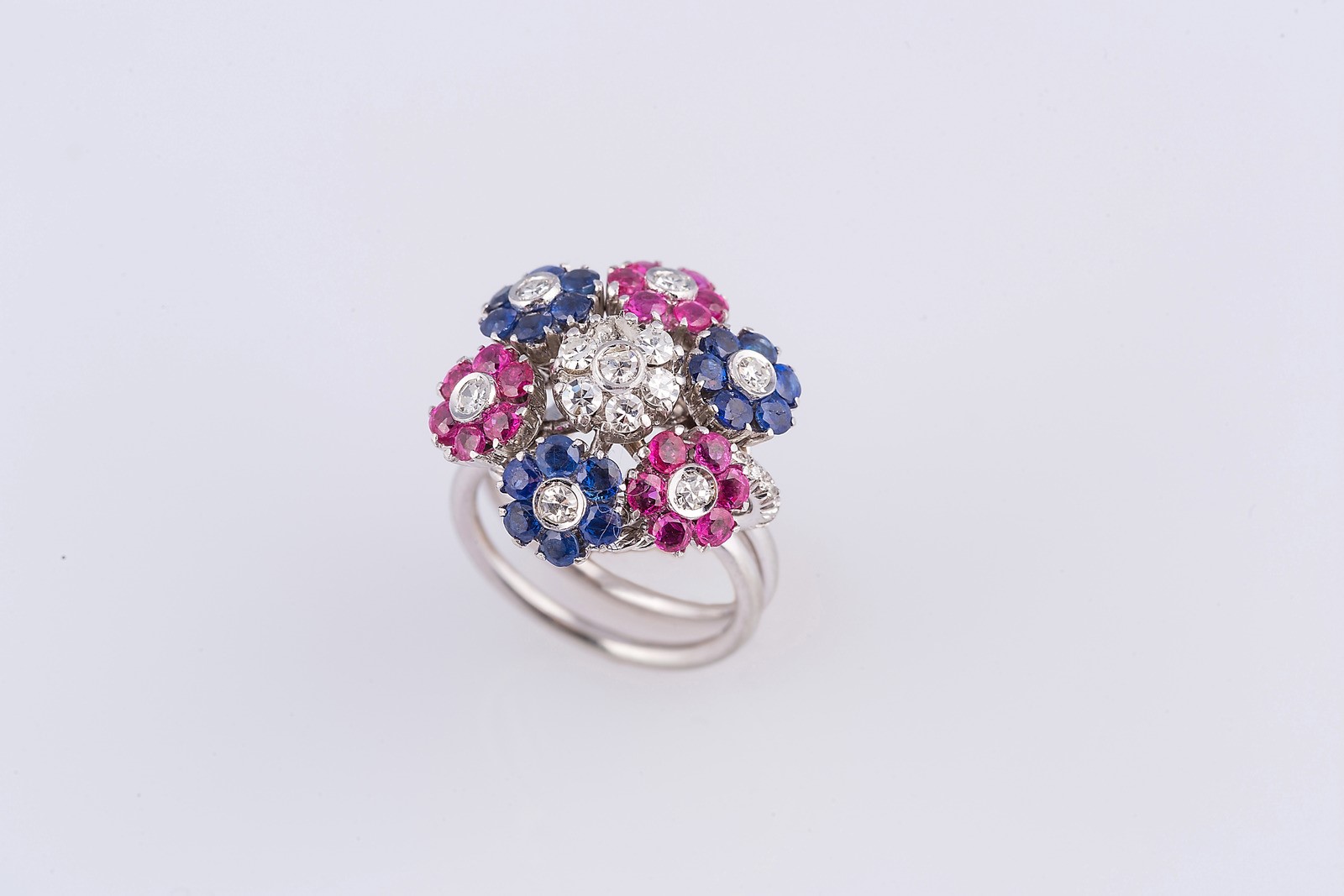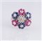Anello "Tremblant" a fiori con diamanti per cts 0.24 zaffiri e rubini per cts 0.85 circa oro 18 kt gr 10.50. . .