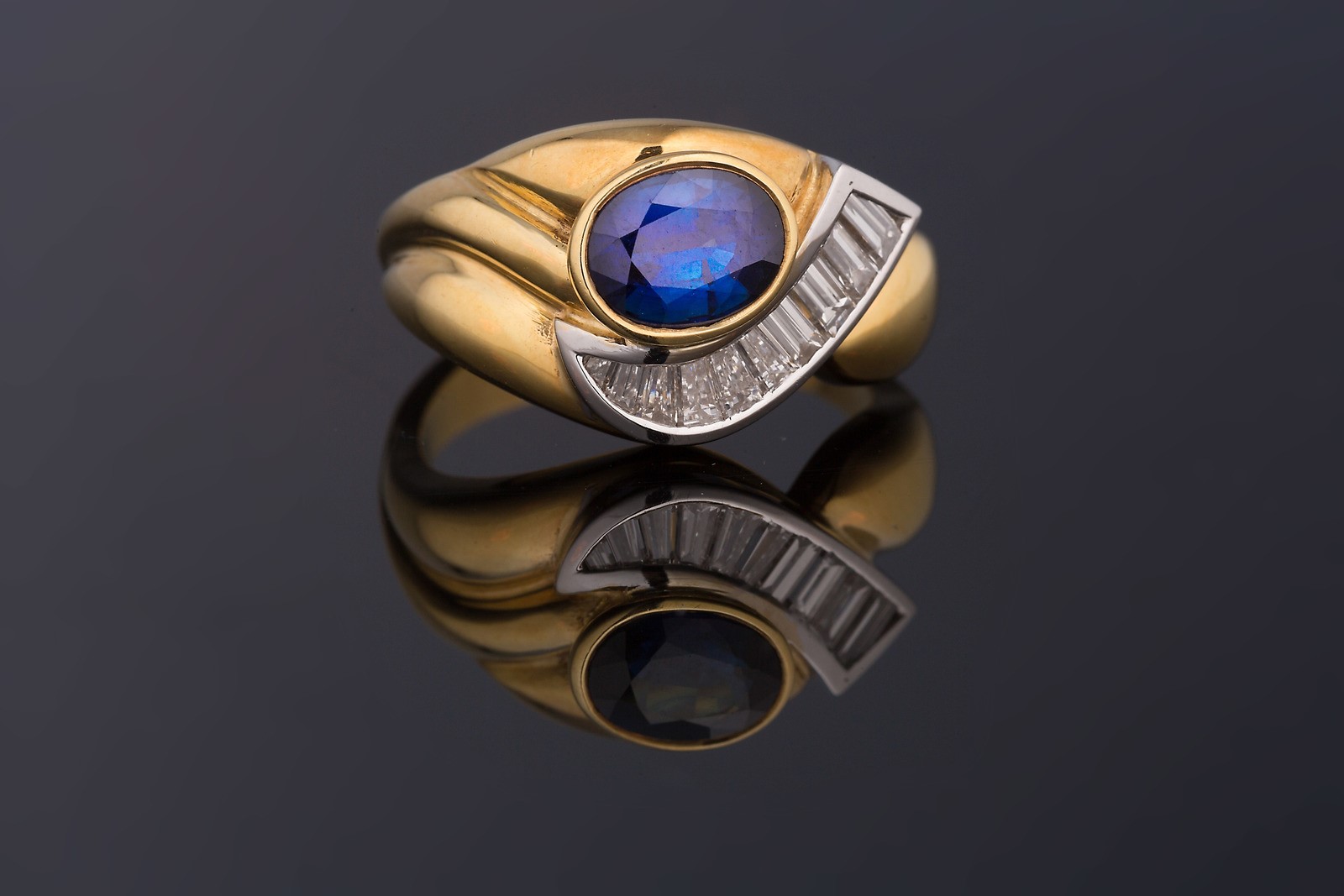 Anello in oro gr 8.30, zaffiro cts 1.53, brillanti ct 0.71. . .
