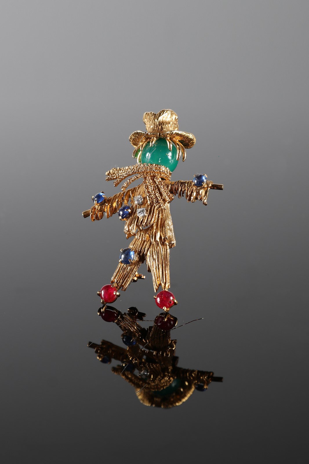 VAN CLEEF & ARPELS Spilla "spaventapasseri" in oro giallo gr 24.40, zaffiri, rubini e diamanti. . .