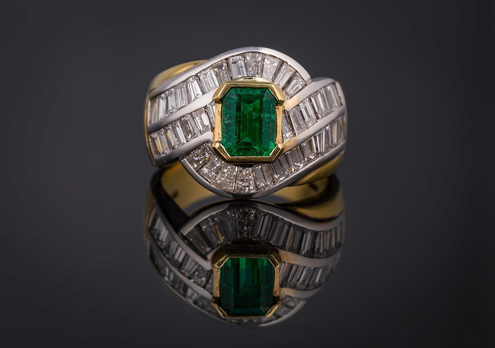 Anello in oro gr 11.40, smeraldo ct 1.07, brillanti ct 2.66. . . [Nessun...
