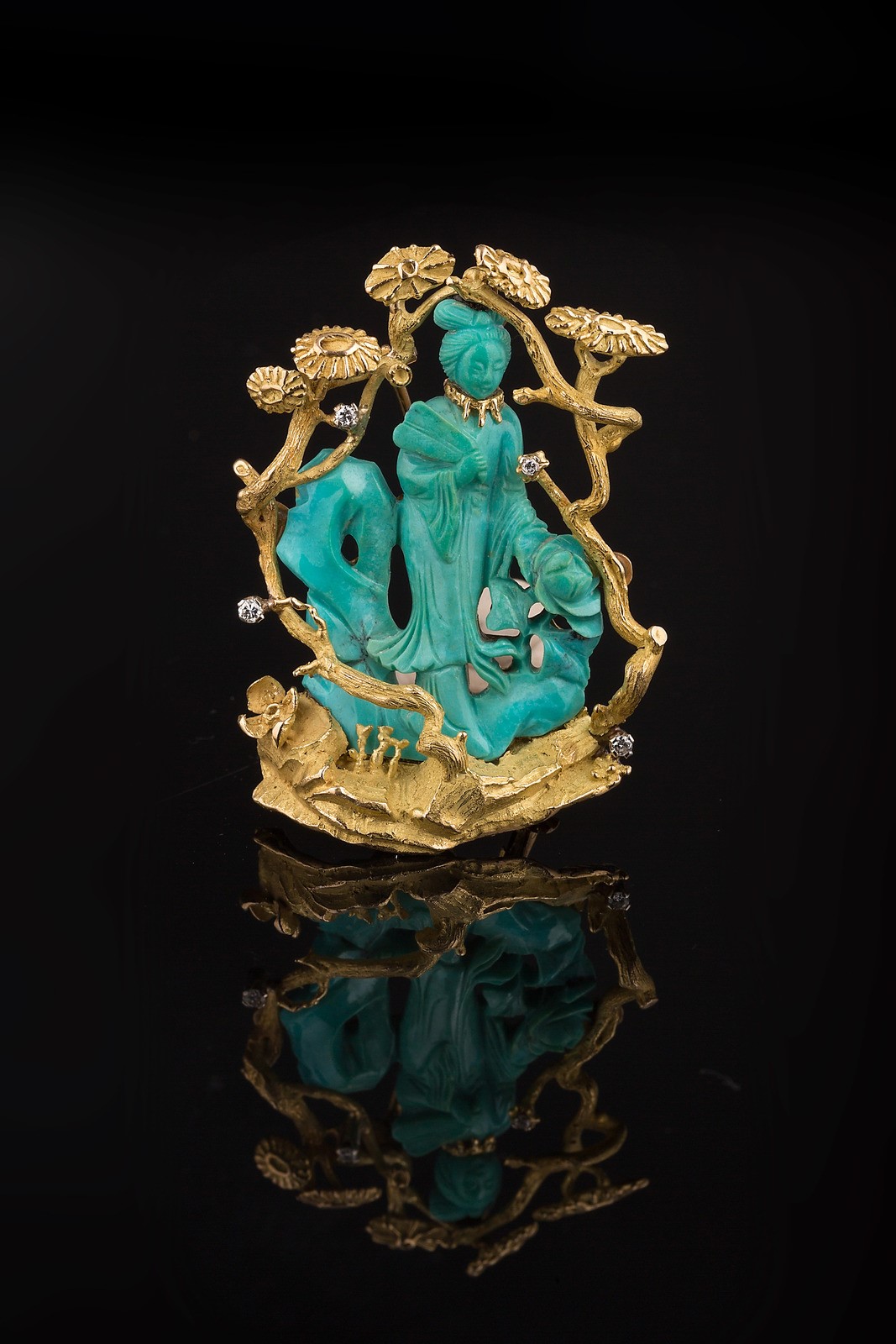 Lot 242 | Spilla in oro e turchese e brillanti. . . [Nessun Autore] . . .