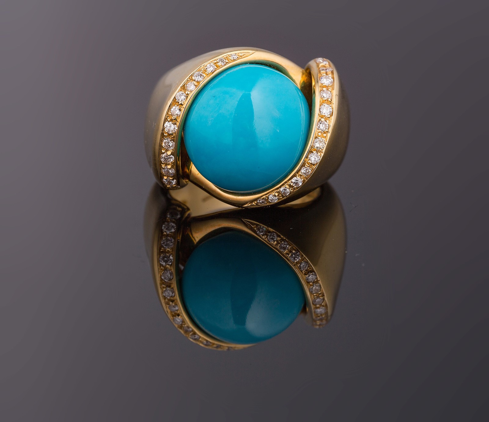 Anello in oro gr 24.80, turchese e brillanti ct 0.28. . .