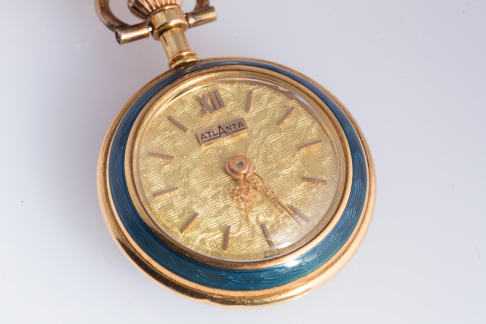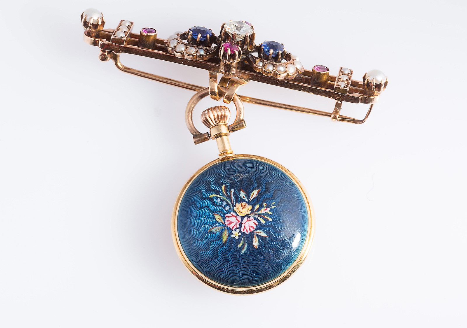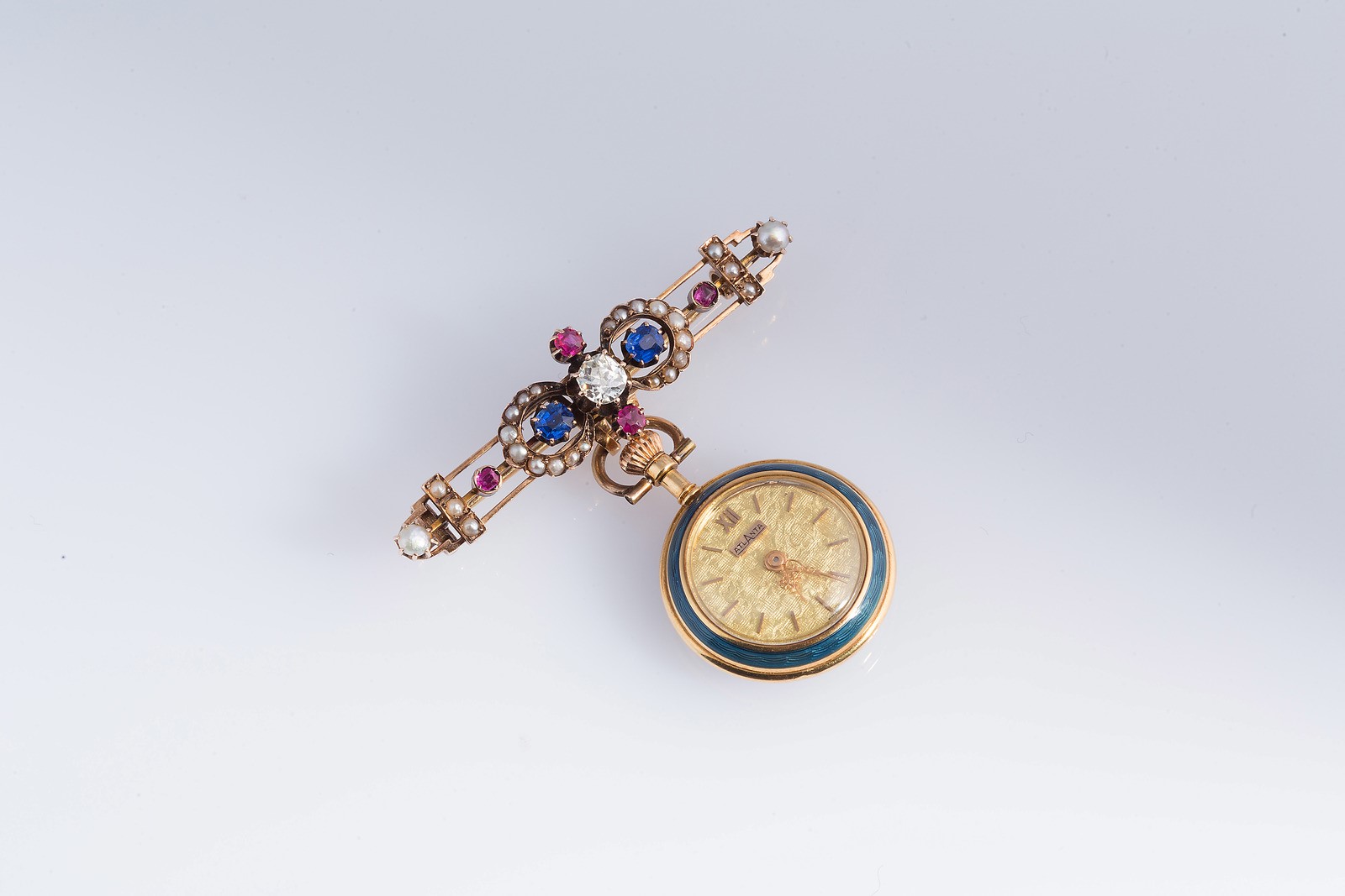Spilla antica in oro rosso con zaffiri, rubini, perle e diamante centrale con orologio in oro e smalto. . .