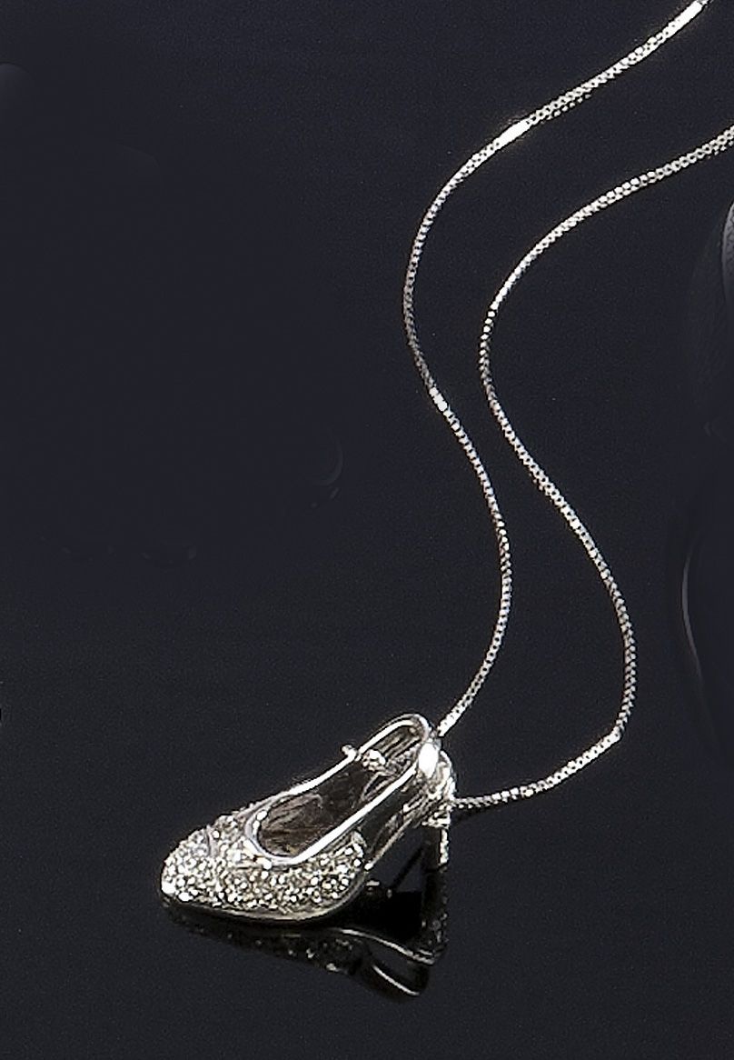 Catena con ciondolo in oro bianco, firmato "Fasano", a forma di scarpetta, con diamanti taglio brillante rotondo per complessivi ct 0,35 ca