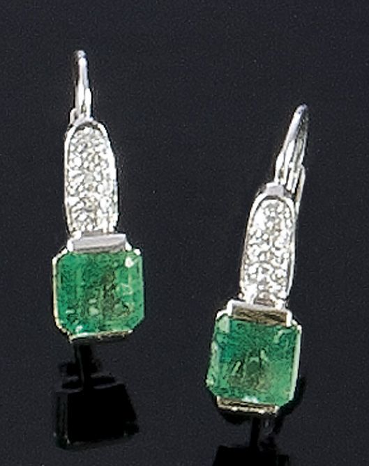 ROCCA Coppia di orecchini in oro bianco, firmati "Rocca", a monachella, con piccoli diamanti taglio brillante rotondo per complessivi ct 0,15 ca terminanti con due smeraldi taglio ottagonale a gradini Peso gr 4,4