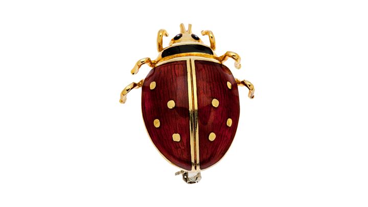 in oro giallo, a forma di coccinella, con smalto rosso e nero