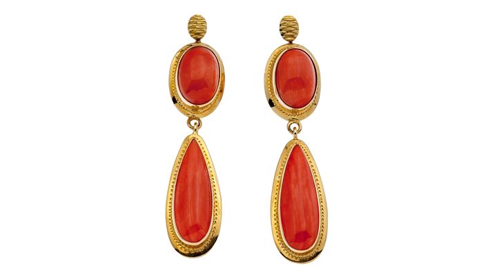 pendenti, in oro giallo, con gocce di corallo giapponese color salmone