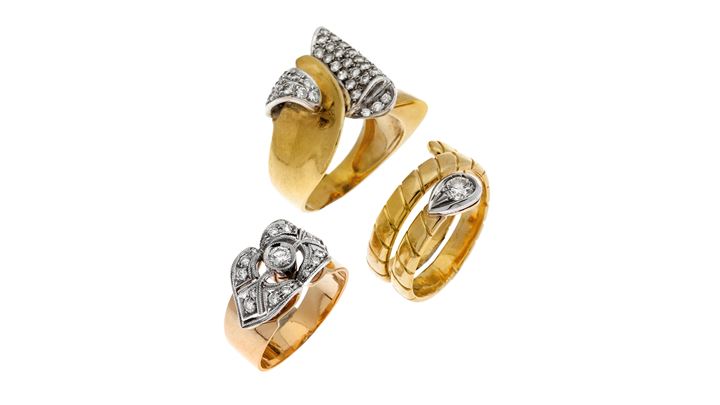 LOTTO DI TRE ANELLI -in oro giallo e bianco, a fascia, con sommità ad...
