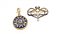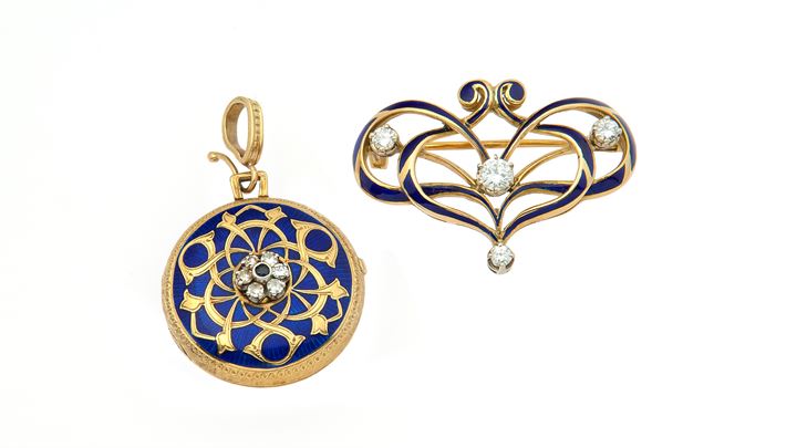 in oro giallo, a forma di volute intrecciate, con smalti blu e quattro diamanti taglio brillante per totali ct 0,35 ca; terminante con un porta ritratto di forma rotonda impreziosito da smalti blu e piccoli diamantini taglio 8/8 ed uno zaffiro