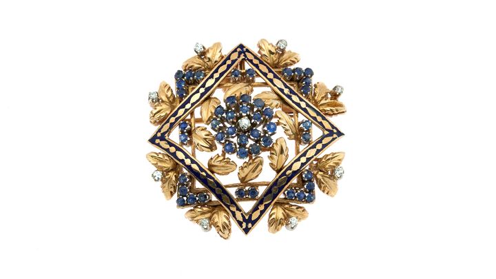 in oro rosa, di forma geometrica, impreziosita da smalti di colore blu, zaffiri taglio rotondo per complessivi ct 0,80 ca e diamanti taglio 8/8 e brillante per complessivi ct 0,12 ca