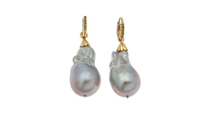in oro giallo, con peridoti taglio rotondo terminanti con grandi perle scaramazze di acqua dolce