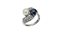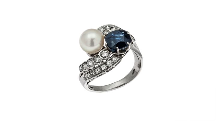 in oro bianco, modello contrariè, con zaffiro taglio rotondo di ct 1,30 ca ed una perla giapponese del diam di mm 7,2; diamanti taglio brillante e 8/8 per totali ct 0,45 ca