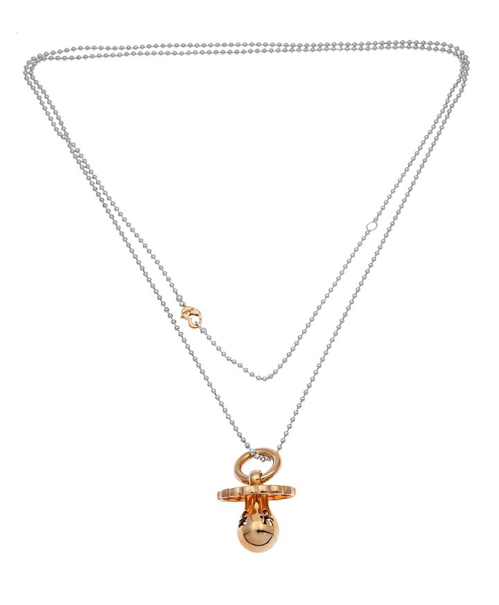 Catena con ciondolo in argento 925/1000 placcato oro rosa, firmato "Le Bebé", modello "Suonamore", a forma di ciuccio con sonaglio integrato