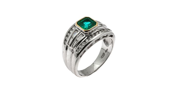 in oro bianco, a fascia, con al centro smeraldo taglio carrè di ct 1,20 ca e diamanti taglio baguette e brillante per totali ct 0,60 ca