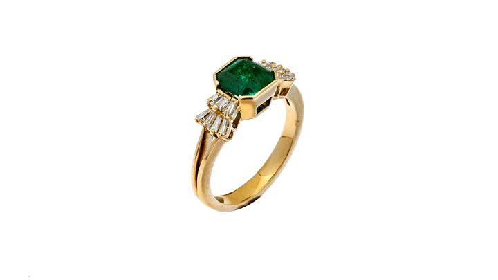 in oro giallo con al centro smeraldo taglio carrè di ct 1,40 ca ed ai lati sei diamanti taglio trapezio (uno scheggiato) per totali ct 0,50 ca