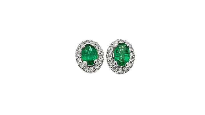 in oro bianco, a lobo, con due smeraldi taglio ovale, circondati da diamanti taglio brillante per totali ct 0,30 ca