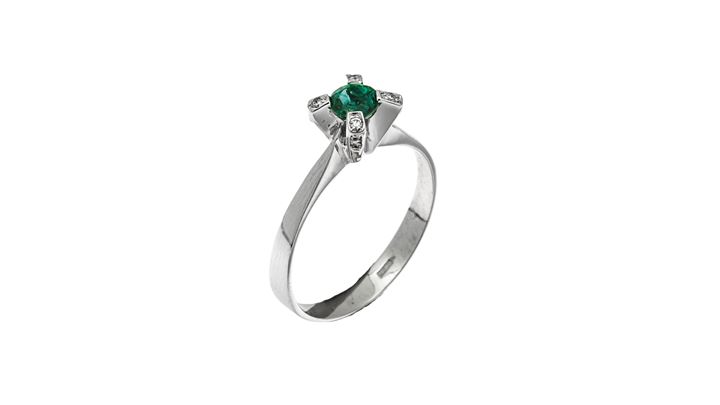 in oro bianco con smeraldo centrale taglio rotondo di ct 0,50 ca, trattenuto da griffes in diamanti taglio brillante