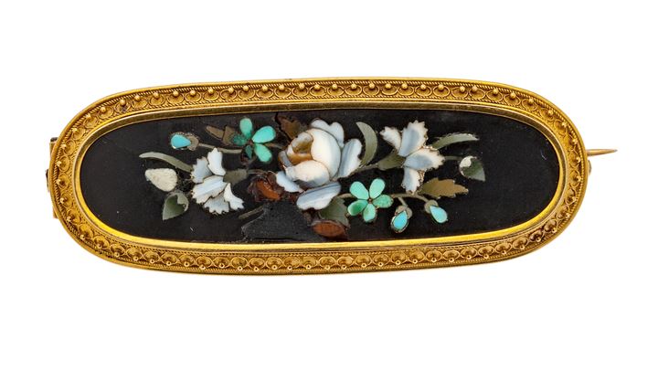 in oro giallo, di forma ovale, con commesso in pietre dure raffigurante dei fiori. Difetti