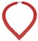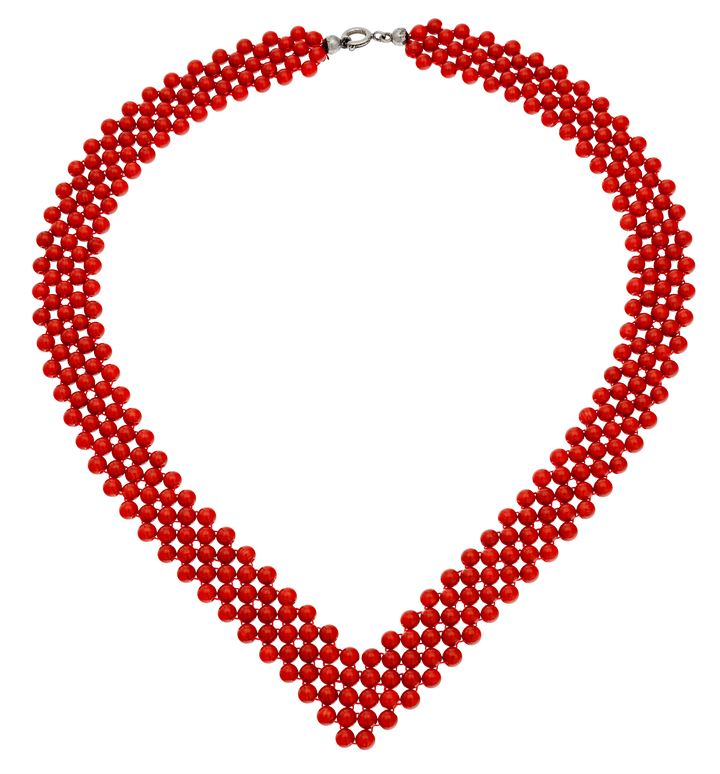 composto da cinque file di sfere di corallo rosso mediterraneo del diam di mm 5,0 ca, lavorate a tessuto. Chiusura in metallo