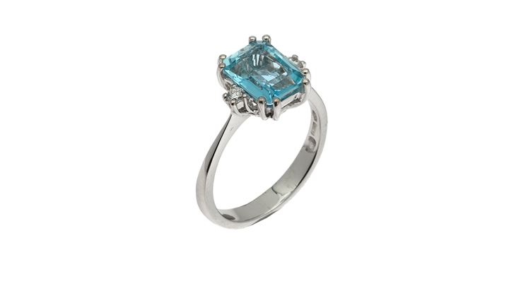 in oro bianco con acquamarina centrale taglio rettangolare di ct 2,0 ca ed ai lati due diamanti taglio brillante per totali ct 0,05 ca