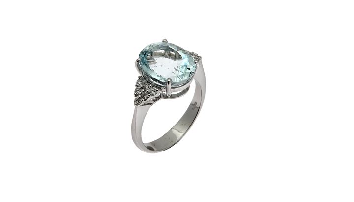 in oro bianco con al centro acquamarina taglio ovale di ct 4,0 ca ed ai lati due triangoli con pavè di diamanti taglio brillante per totali ct 0,15 ca