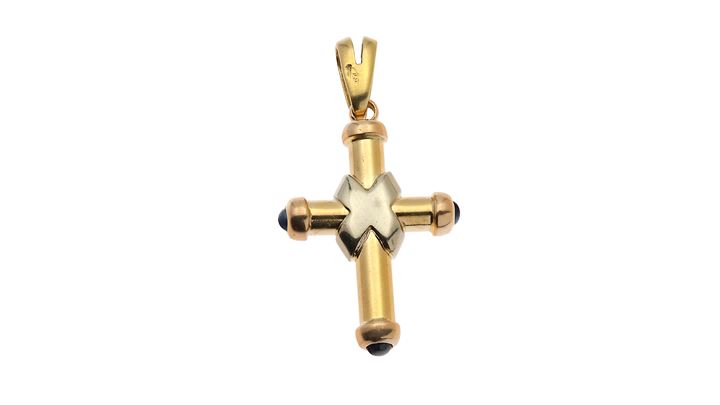 in oro giallo e bianco a forma di croce con terminali in zaffiri cabochon per totali ct 0,45 ca