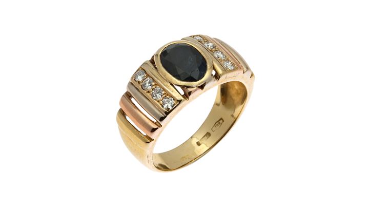 in oro giallo, con zaffiro centrale di ct 1,50 ca e otto diamantini ai lati per totali ct 0,15 ca