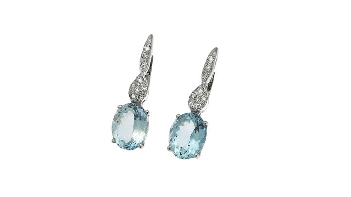 in oro bianco con elemento rigido in diamanti taglio brillante per complessivi ct 0,20 ca , terminati con due acquamarine taglio ovale di ct 8,0 ca