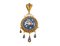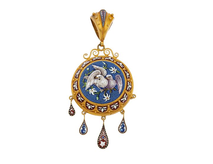 in oro giallo, di forma ovale, con volute laterali e micromosaico centrale con coppia di colombe e fiori su fondo di colore celeste. Piccole gocce in micromosaico di forma geometrica (una goccia mancante). Al retro reca contenitore porta capelli o foto con vetro
