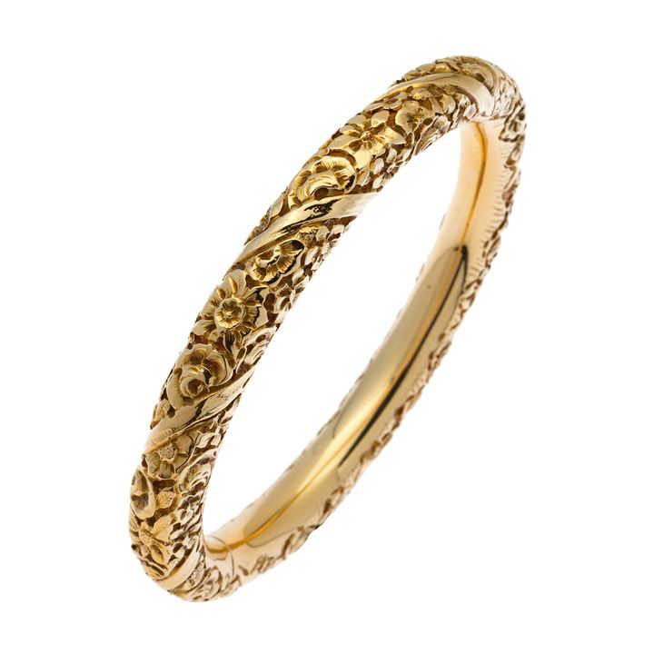 rigido in oro giallo, lavorato a canna vuota, con decori vegetali e floreali